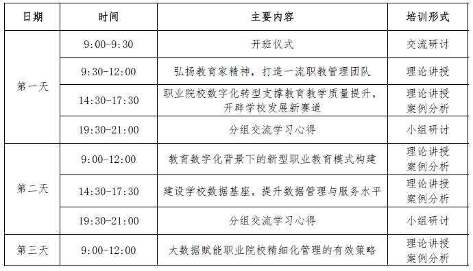 为深入贯彻习近平总书记关于教育的重要论述和党的二十大和二十届二中、三中全会精神,依据《教育强国建设规划纲要(2024-2035 年)》《中共中央国务院关于弘扬教育家精神加强新时代高素质专业化教师队伍建设的意见》《关于深化现代职业教育体系建设改革的意见》《教育部财政部关于实施职业院校教师素质提高计划(2021—2025 年)的通知》等文件要求,由全国重点建设职业教育师资培养培训基地(陕西工业职业技术学院)、国家级职业学校校长培训基地牵头,联合核心成员单位-山西华兴科软有限公司,拟开展教育数字化转型背景下中职学校管理团队领导力提升培训项目。现将有关事项通知如下: