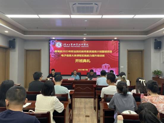 青海省2023年度职业院校教师素质提高计划电子信息大类课程实施能力提升培训班在我校顺利开班,我校副校长段峻、青海省职业院校师资培训项目管理办公室副主任刘清海、信息工程学院院长白国政、继续教育与培训学院副院长贾严鹏以及来自青海省中职学校的30位学员及相关管理服务人员参加了开班典礼。典礼由贾严鹏主持。