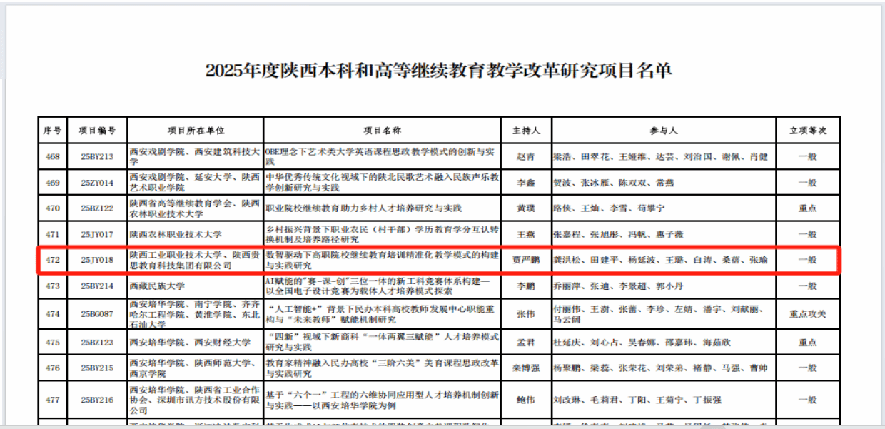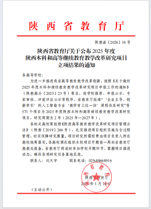 近日,陕西省教育厅印发《关于公布2025年度陕西本科和高等继续教育教学改革研究项目立项结果的通知》(陕教函〔2026〕16号),我校继续教育与培训学院申报的《数智驱动下高职院校继续教育培训精准化教学模式的构建与实践研究》课题成功获批立项。