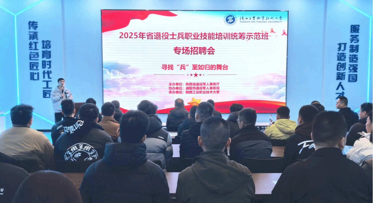 为响应国家促进退役军人高质量就业的决策部署,确保陕西省退役士兵职业技能培训工作持续深化,1月9日上午,2025年度省级退役士兵职业技能培训统筹示范班专场招聘会在渭城校区圆满举行。陕西省退役军人事务厅就业创业处处长陈燕青、咸阳市退役军人事务局副局长程清志,我校党委委员、副校长刘清,继教学院院长闫军、汽车工程学院副院长许冀阳,机械工程学院党总支副书记郭旭华,企业代表与全体培训学员共计60余人参与了本次招聘盛会。